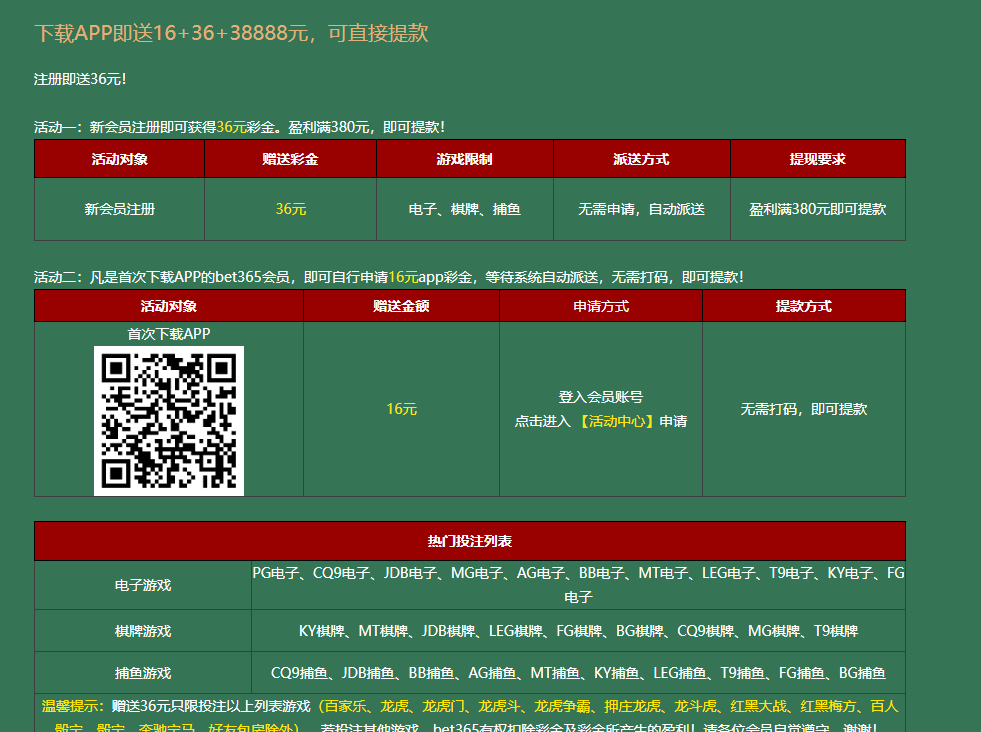 动一:新会员注册即可获得36元彩金。盈利满380元,即可提款!