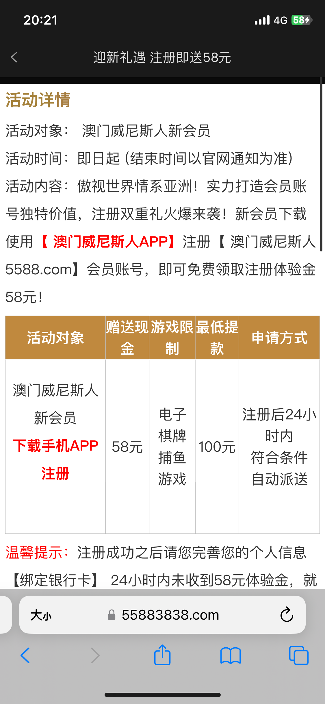 无意中给我拦截弹出来的,看了一下有个注册24小时内送58的,反正我没送,各位老哥自测