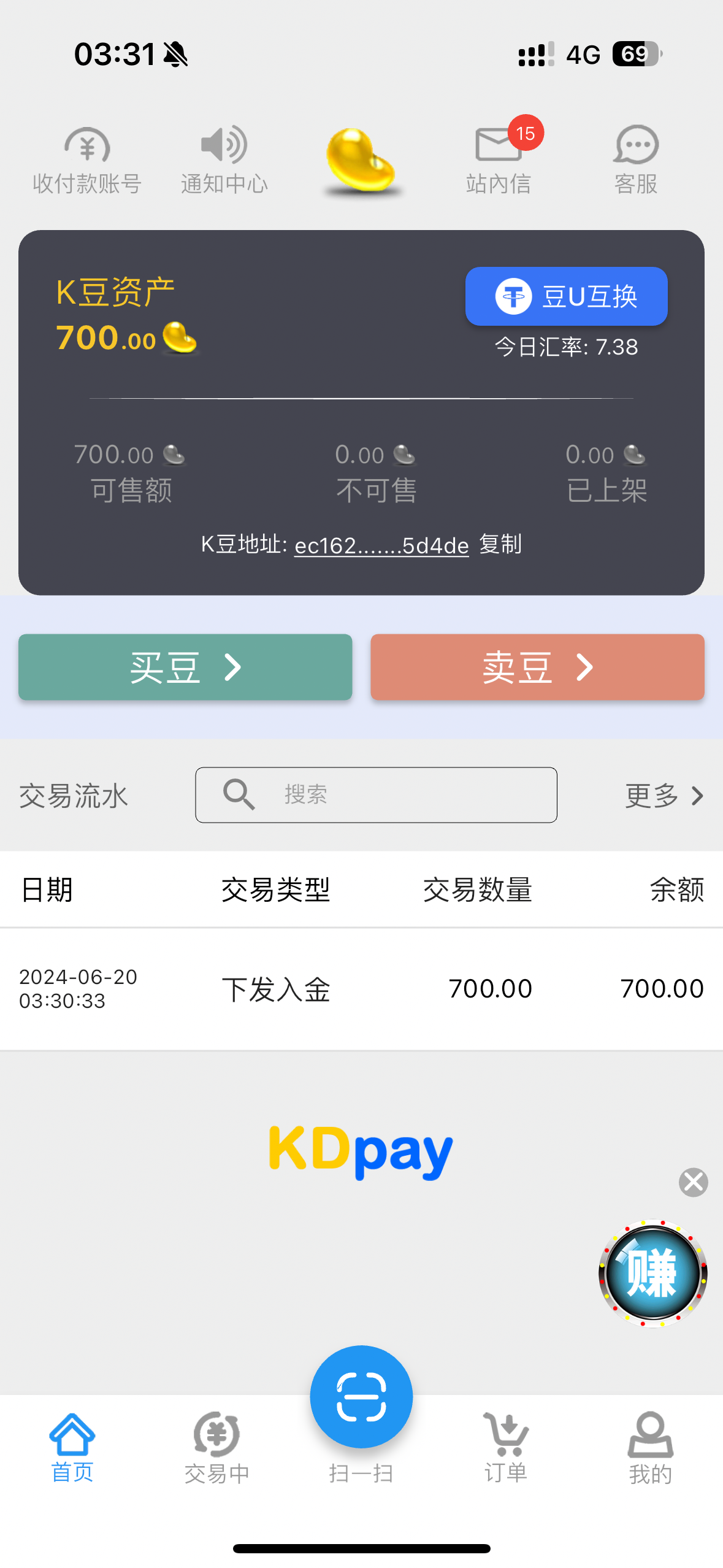 第一次K豆提款给我取消了  我以为黑了  找客服说K豆通道拥挤   换支付宝提款到账了