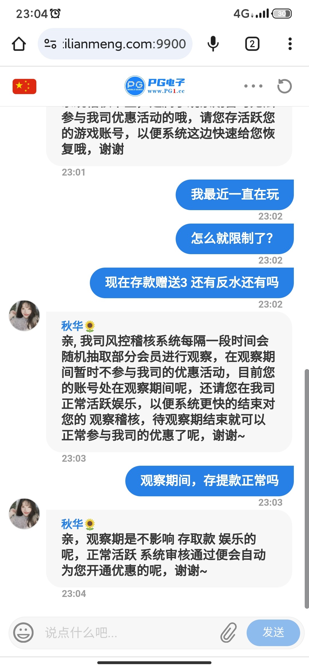 这个小蓝台我真的也不怎么敢玩,3 4个平台了玩几天账号就被限制优惠了,别说签到反水都不给了。我有的台子上周输了几千,今天提了1000,钱给我了,把我账户又嘿限制优惠了