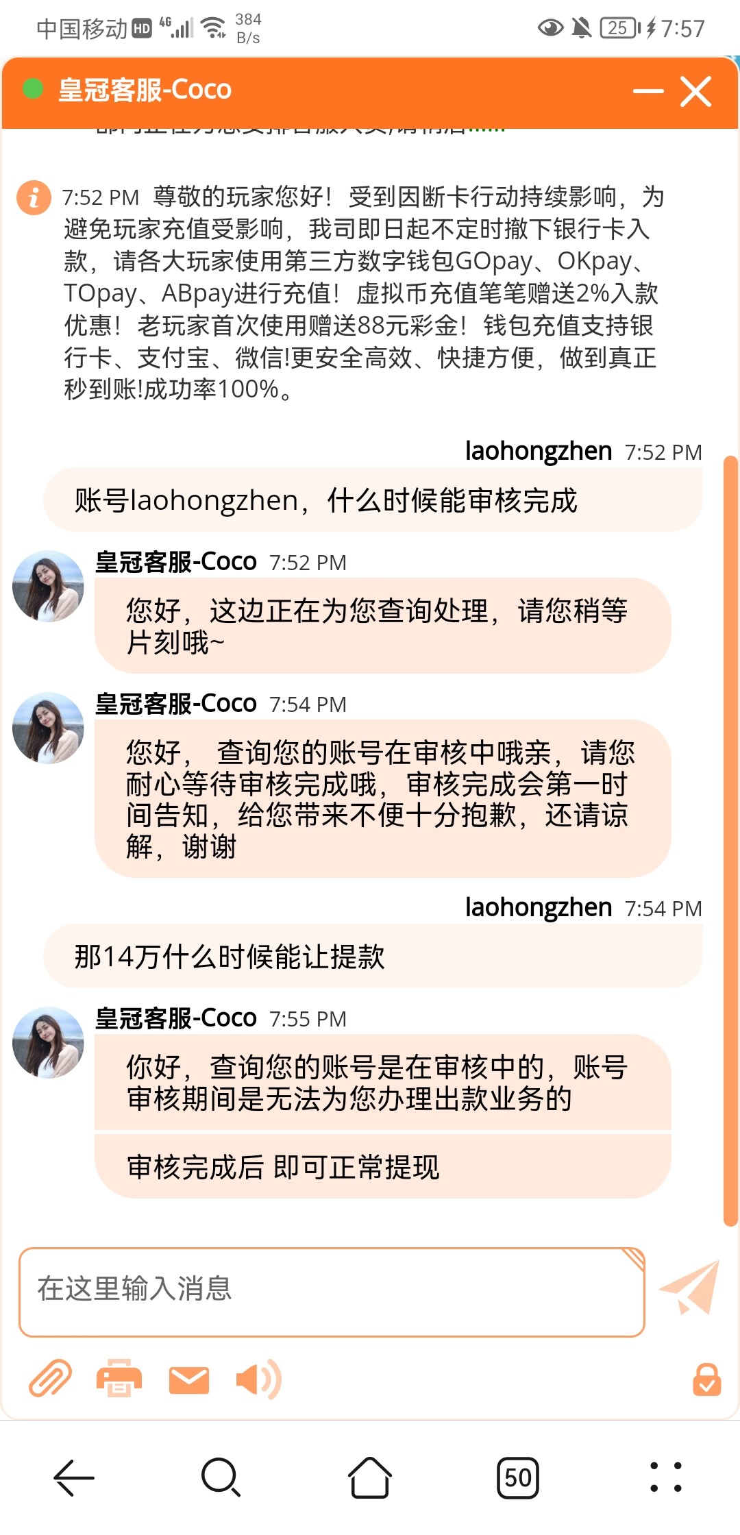 好 这个皇冠你7500万流水以前也是肯定给你出过大额的 可以理解
