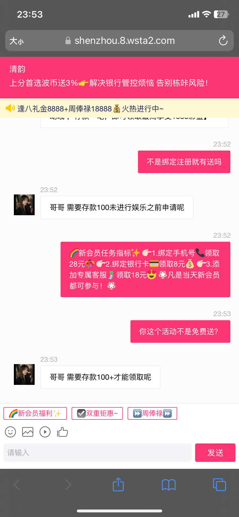 注册送8彩金,打到100用波币提款还能在领取28,领完还有首存活动,第一次提款要核实身份,要用自己手机号,网站8fyaxp.top