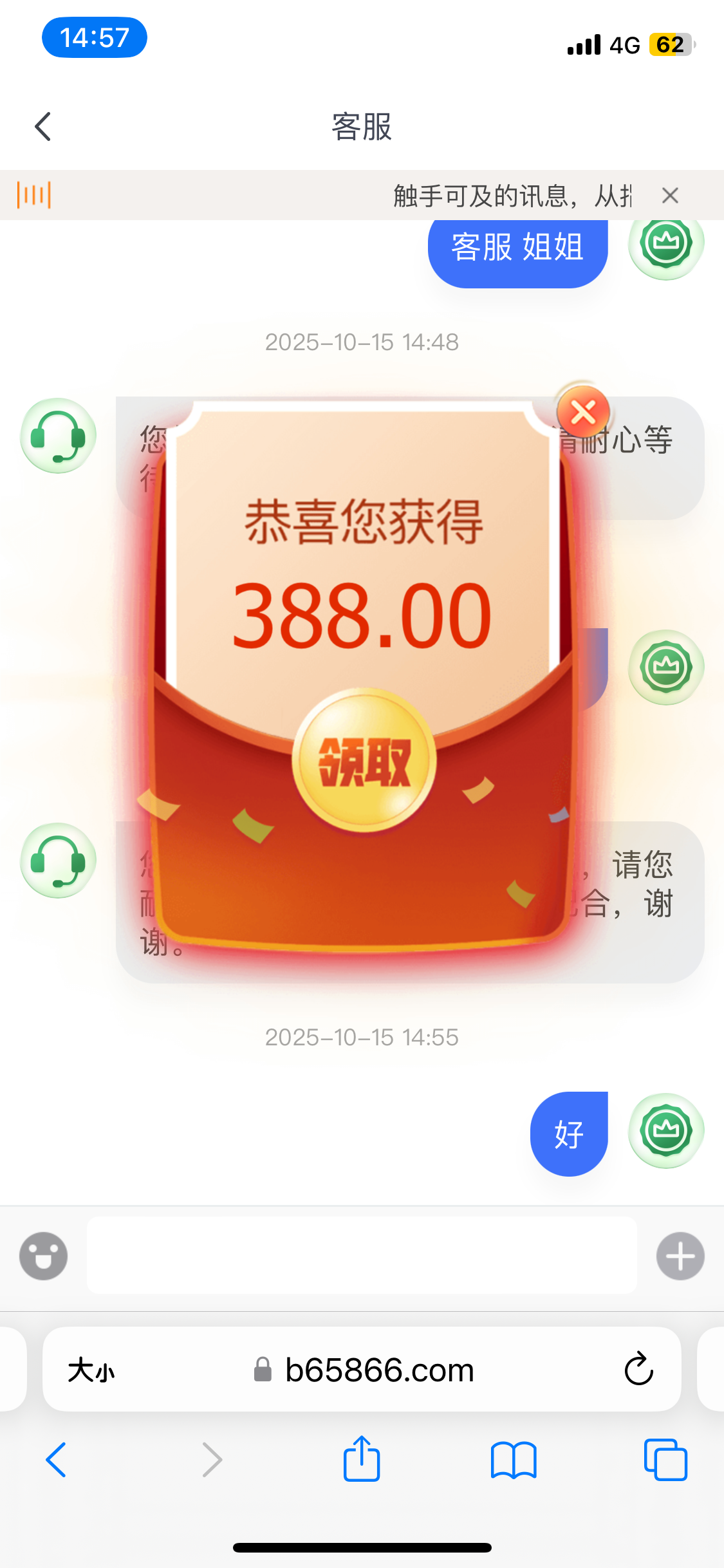 以前可以领取好几次388的bet365貌似活动又开始了 今天打电话过来让我领取了 老哥们可以去碰瓷一下