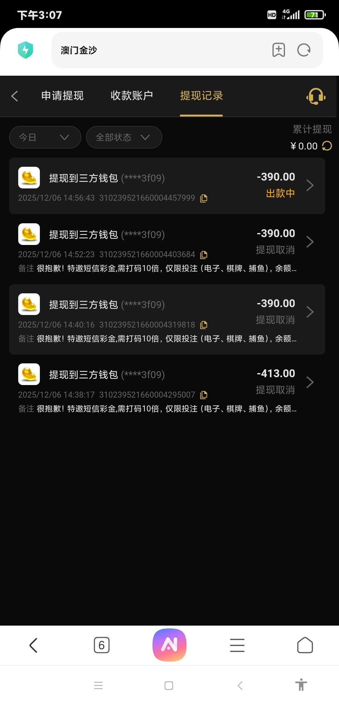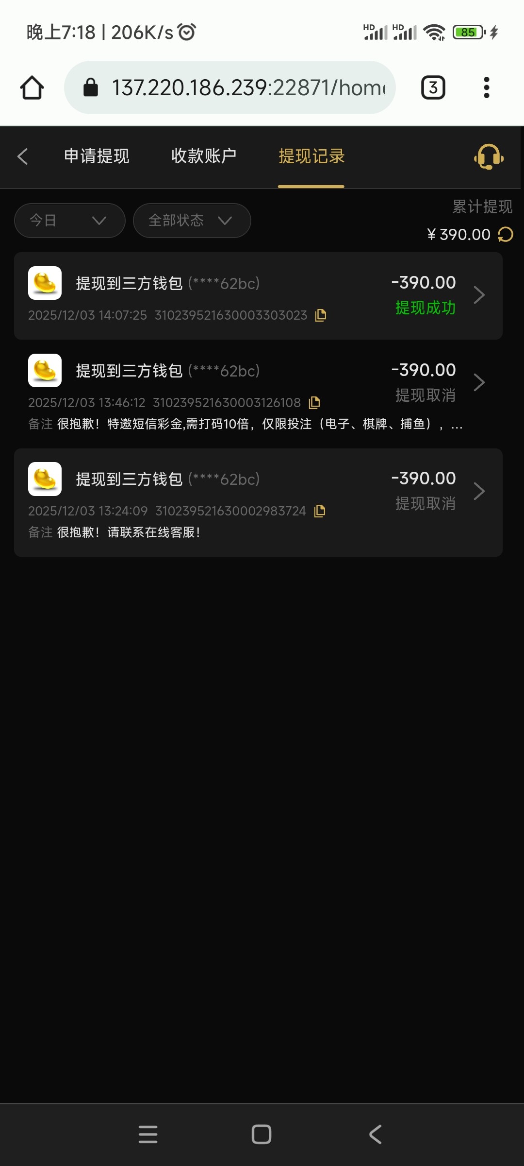 垃圾台,充值300玩捕鱼盈利,200,之后去玩街机射龙门,流水有有1千多,打不上去,之后提款700,退回,说注单异常,叫打5倍流水,只能玩射龙门,最后洗白,
