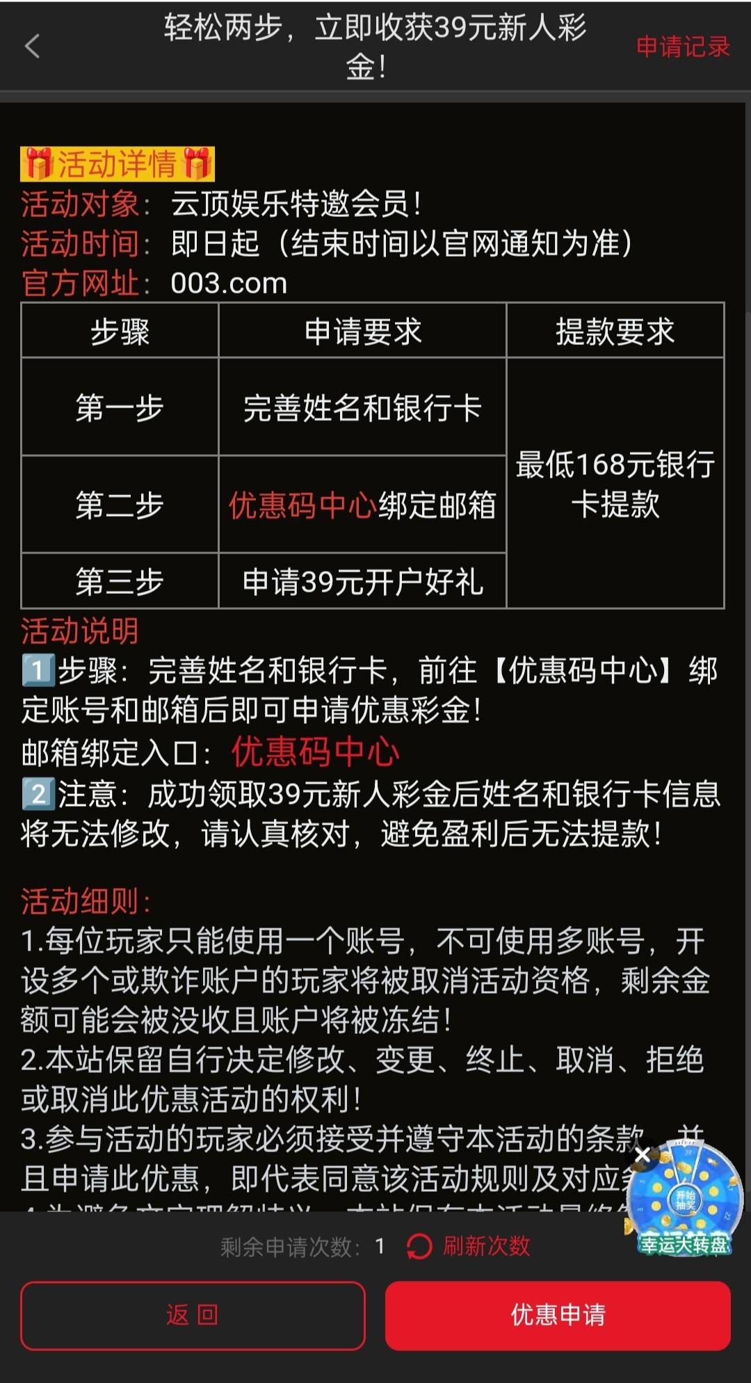 新用户注册先去安全中心绑定个人信息 再去优惠码中心入口的地方选择新用户入口 去验证邮箱 然后再去轻松两步去申请