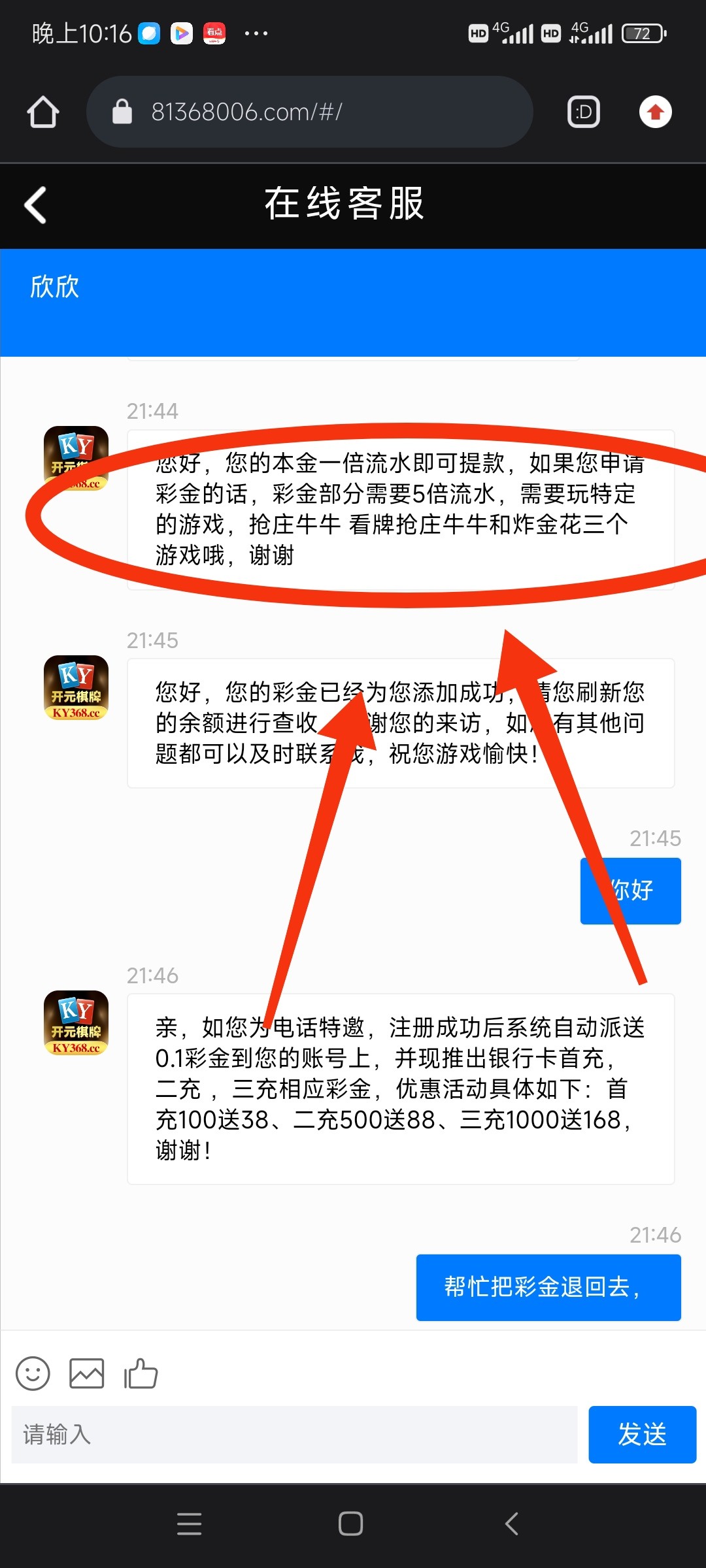 ky368.cc电话特邀说免费送,注册账号就说送0.1也叫送,申请了首存之后,被限制只能玩炸金花,和抢庄牛牛还需要5倍流水,