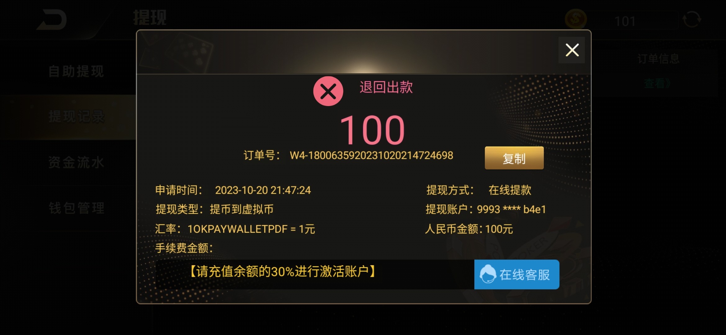要充值百分之50 我充了60提现到账