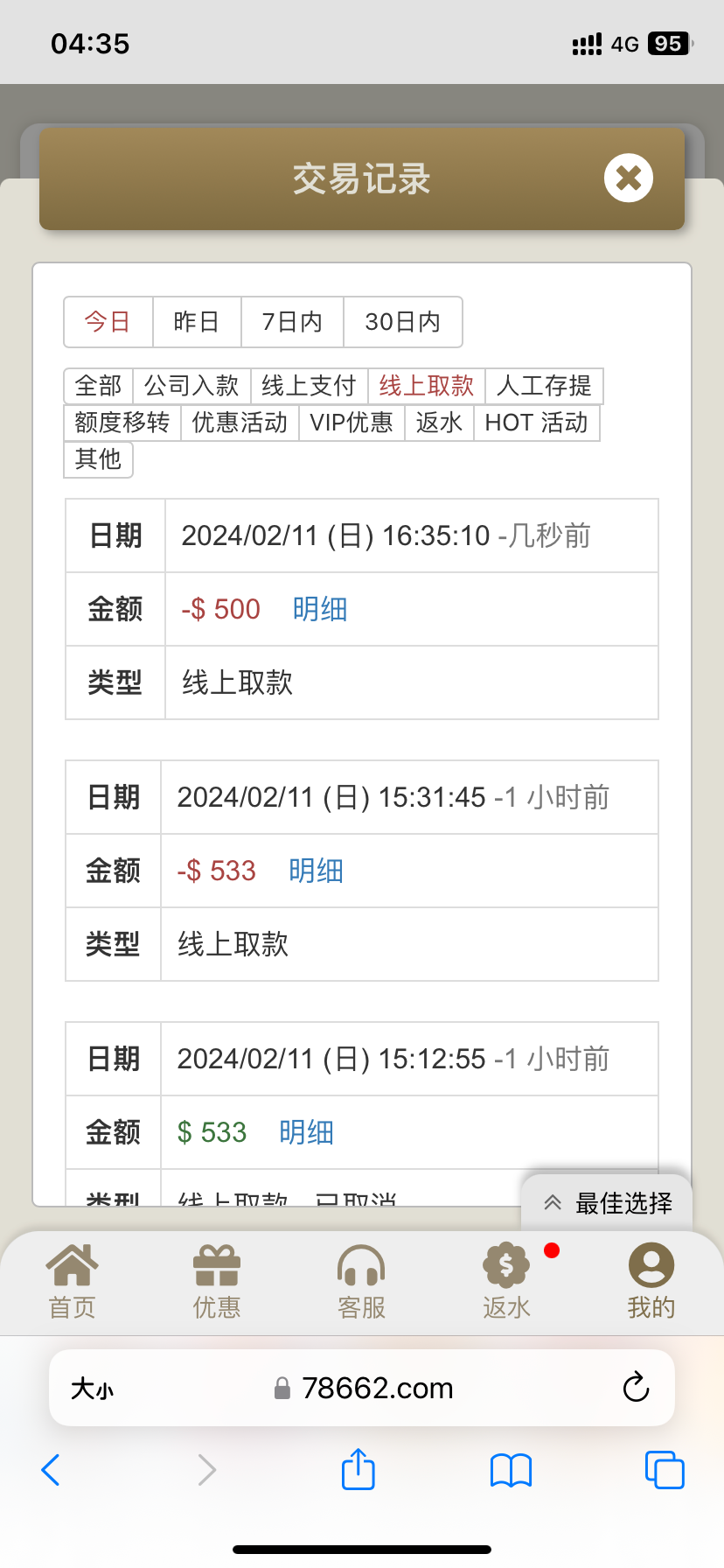 前一会1块反水上500,接着回充搞50+48又出咯