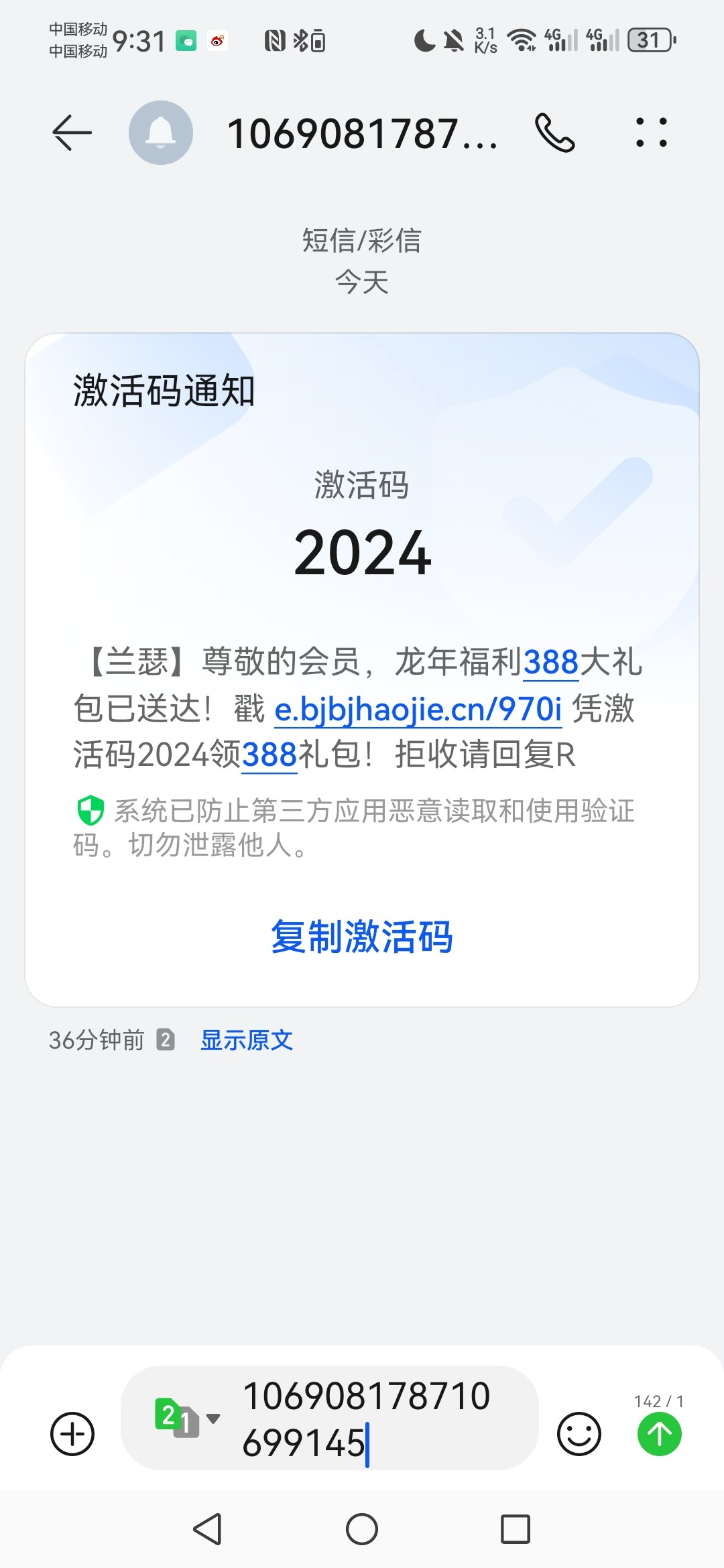 【兰瑟】尊敬的会员,龙年福利388大礼包已送达!戳 e.bjbjhaojie.cn/970i 凭激活码2024领388礼包!拒收请回复R(网址)他要是要短信的话p图
