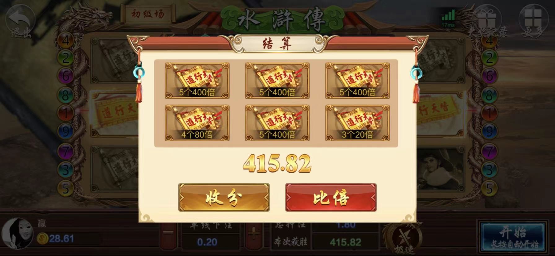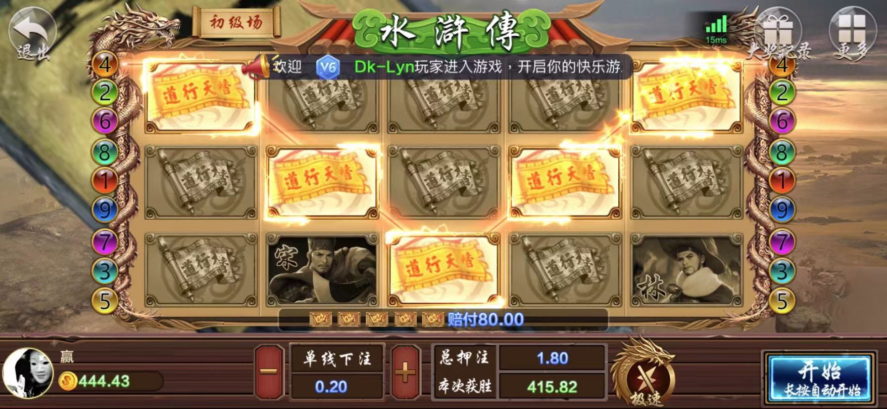 打出来了不知道能不能到,进去玩老虎机点俩下就一百多了