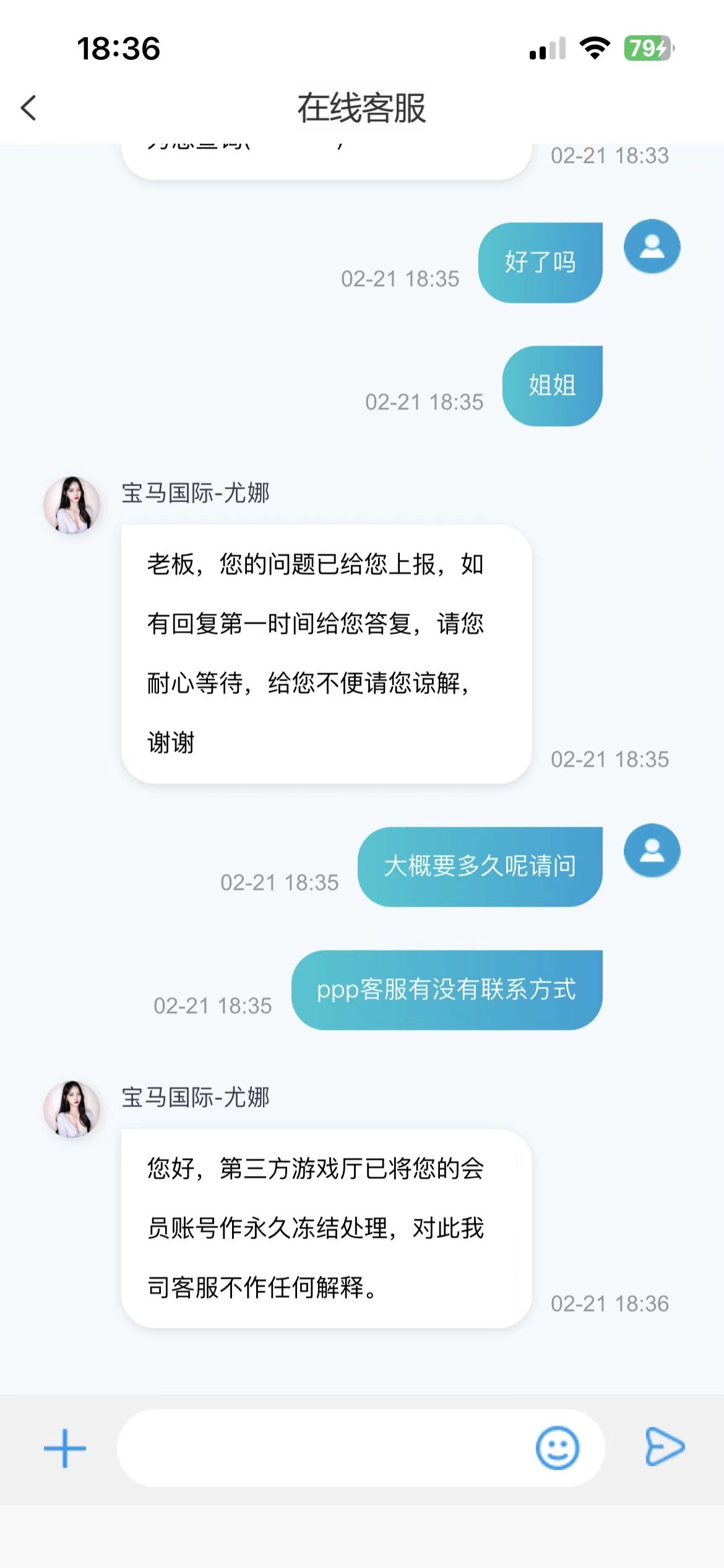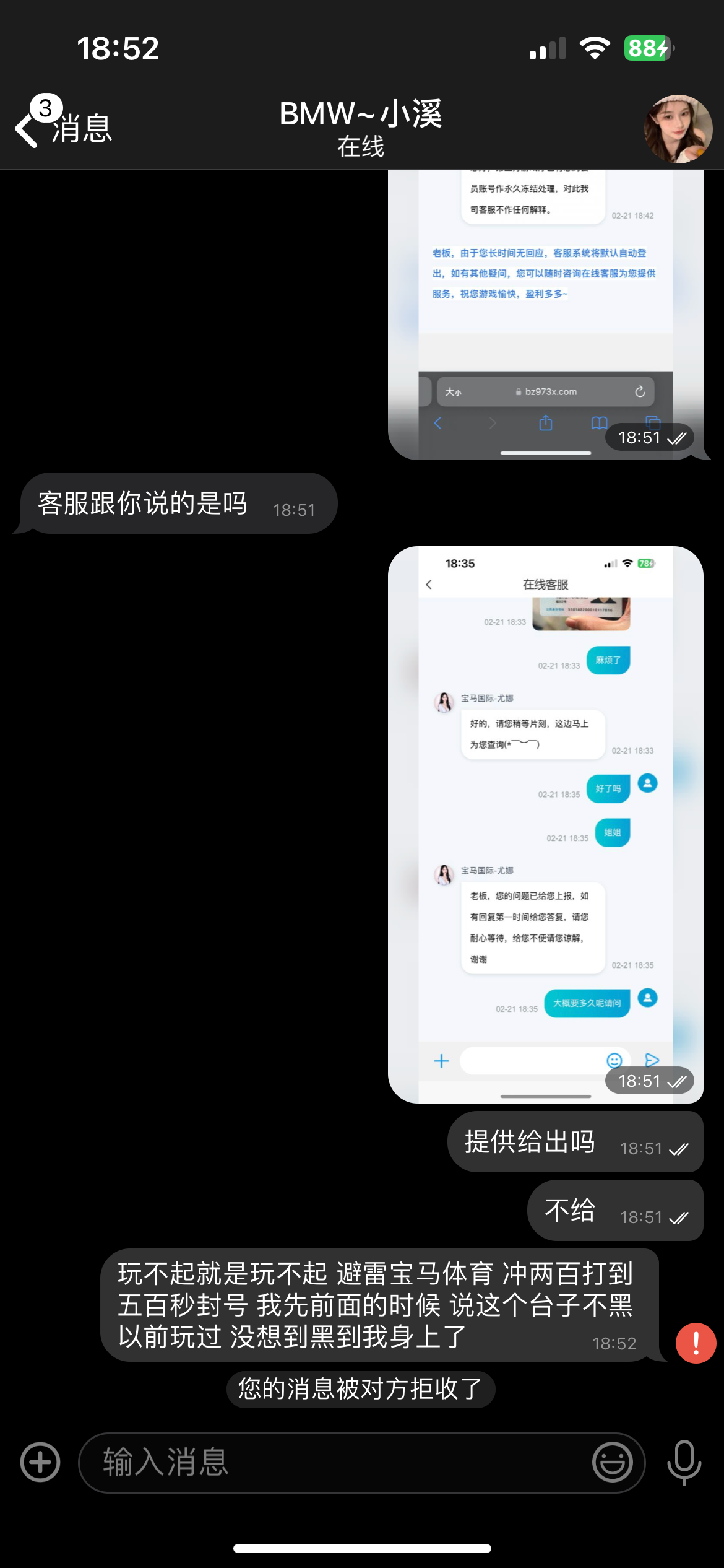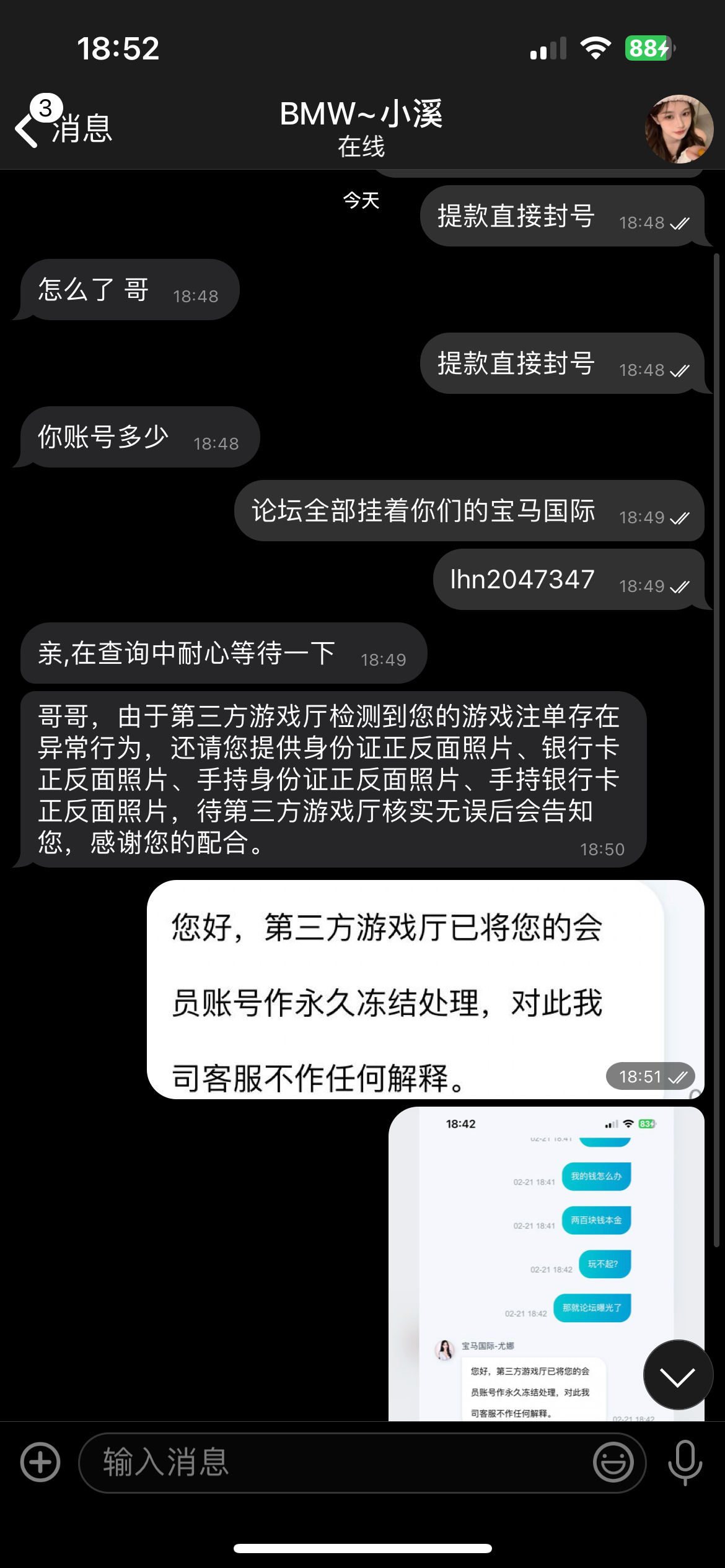 宝马国际黑平台 以前玩提现秒到 今天电话过来的 200+88 打到了五百 直接封号了 黑平台一个 账号直接冻结了 不要去玩 不要上这个平台 黑逼台一个 说的一倍流水 给了不出款 直接封号 本都不退 不要去玩这个平台 黑笔台子