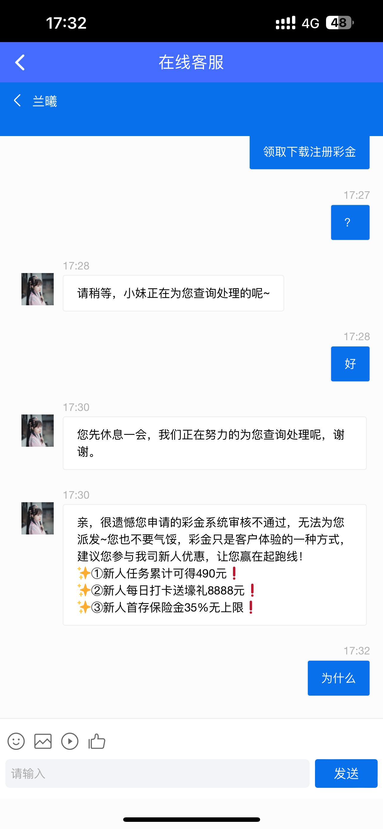 很遗憾您申请的彩金系统审核不通过,无法为您派发~您也不要气馁,彩金只是客户体验的一种方式,目前尚未有符合您的彩金优惠哦~建议您参与我司新人优惠。