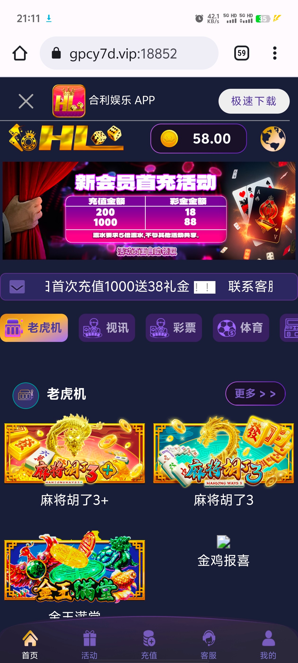 新用户注册点到活动直接秒58彩金,看到速去,人多卡的话就等人少试试吧切记勿充值。