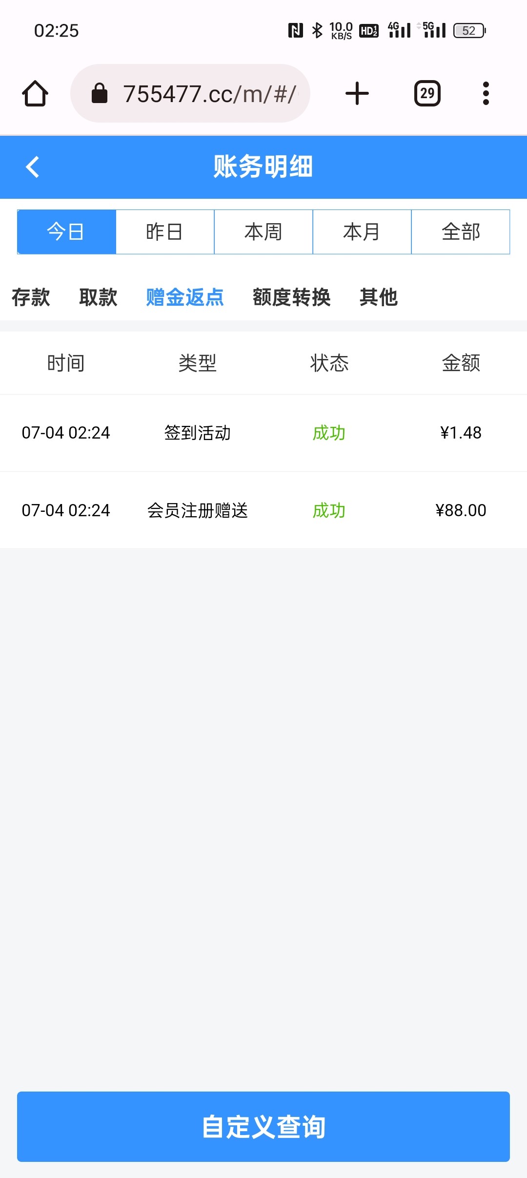pg1站小蓝签到台不黑 之前撸签到的时候3.54硬生生打到3000多充值50然后只给提188+50上个星期打电话给我说送我7天免费签到每天都12打底第二天就赢到118提再充100打了4w流水七七八八赢了个4q后面又送了回去提现基本秒到