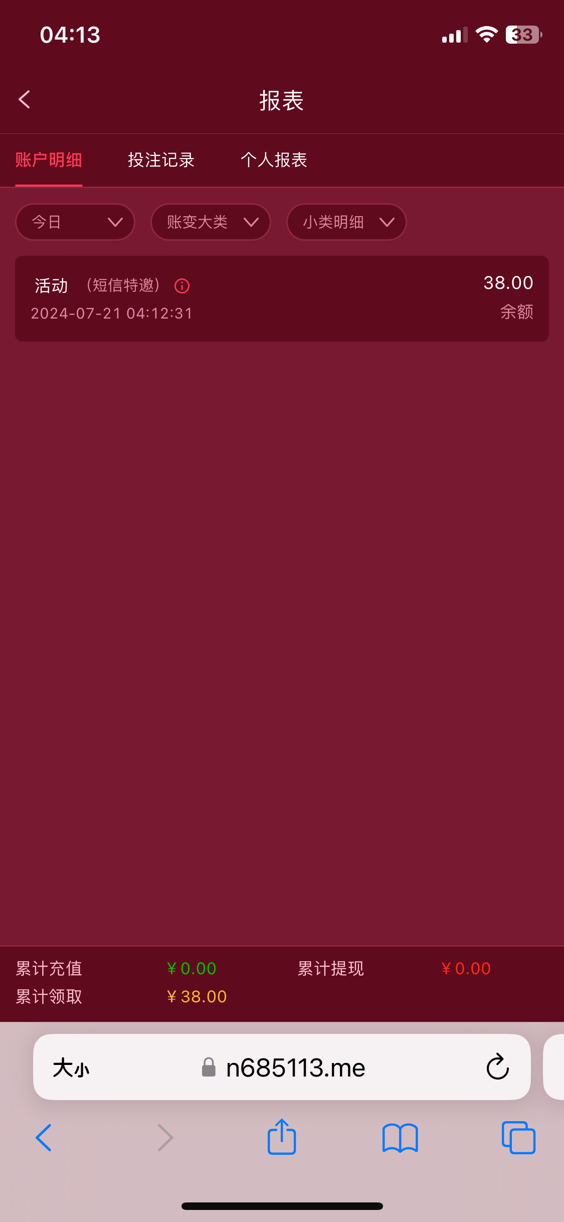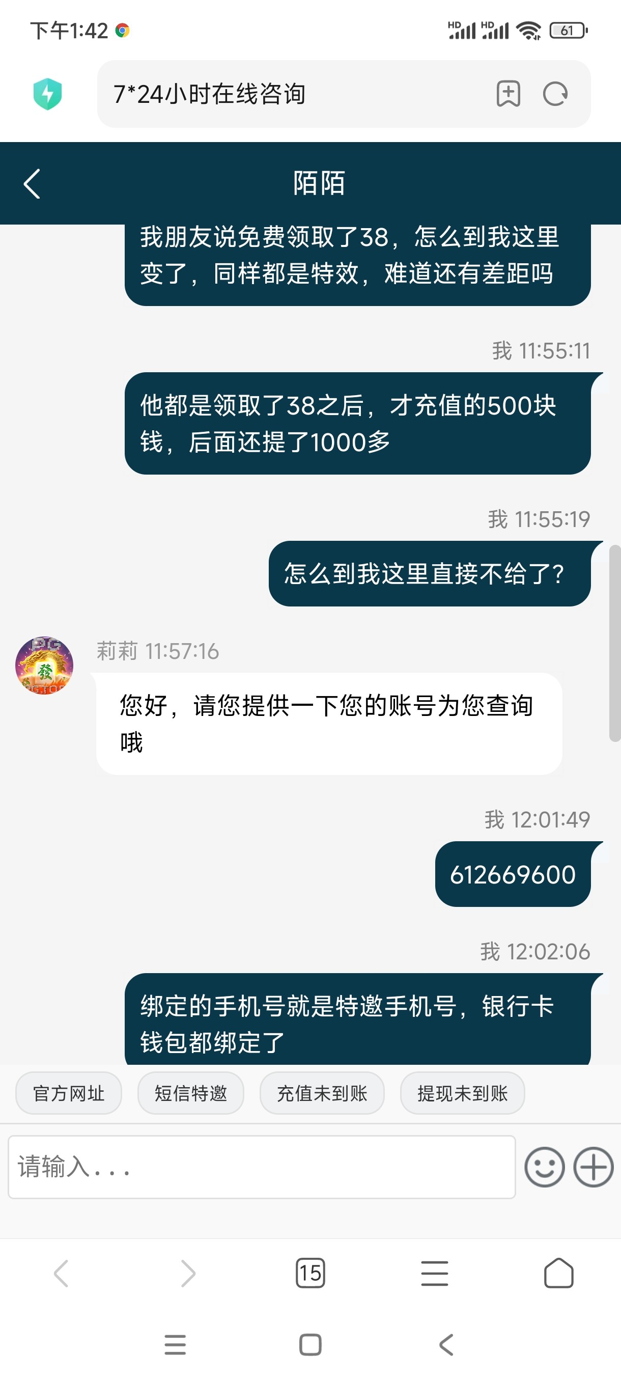 不会说怎么领得到?,我说我朋友注册都领到了,然后充值了500,提了1000多,说这个平台还不错,怎么不给我领?我都没有短信截图,都领到了38