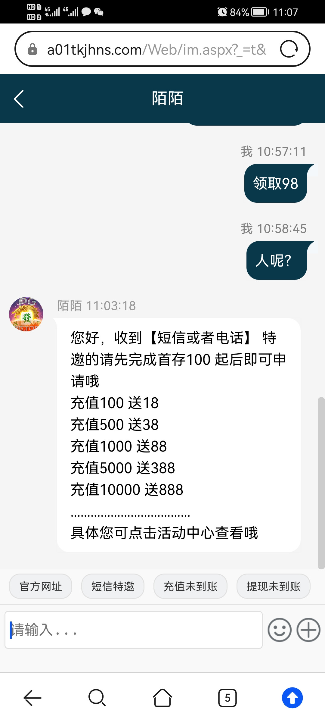 只能找陌陌这个客服,其他客服都让充值,我一点找的陌陌都送了38