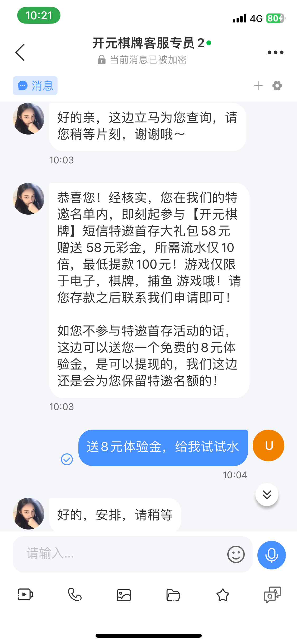 注册发信息给客服跟她说短信特邀叫你发图再发