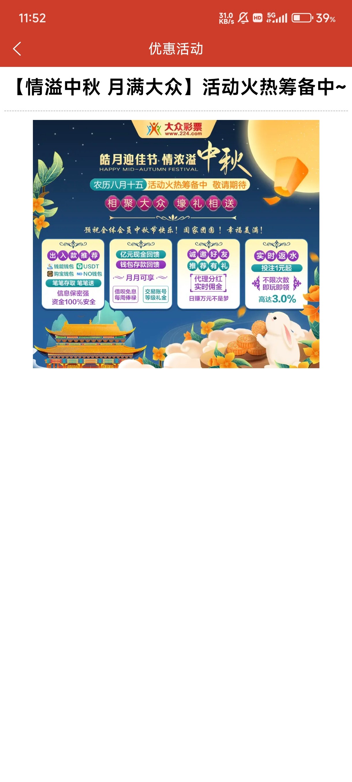 别做梦了  中秋就是那种20多彩金  充值的两个20多那种跟抢红包活动  没有充值回馈