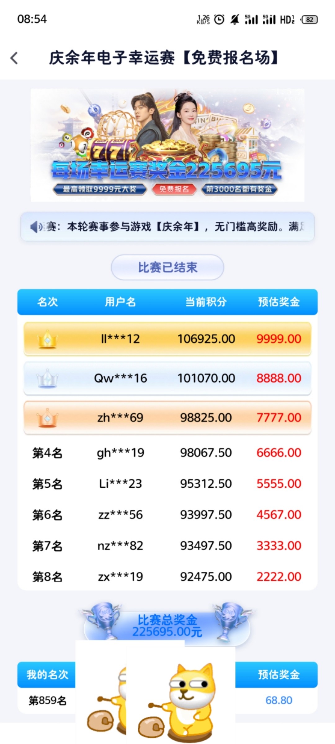 一点都不好玩22号我就玩过,4毛的注进去就一直空转我最高连续空70次旋转,然后连几下给几块钱反正特别空,而且和你一样积分的人一大把,不是前3000名报的就去体验一下吧,不会有的,300次免费打了134积分.反正是免费的碰碰运气就行,我22号玩的时候限时是30分钟免费还没有用完比赛就结束了,奉劝大家去网络好的地方玩人多特别卡.