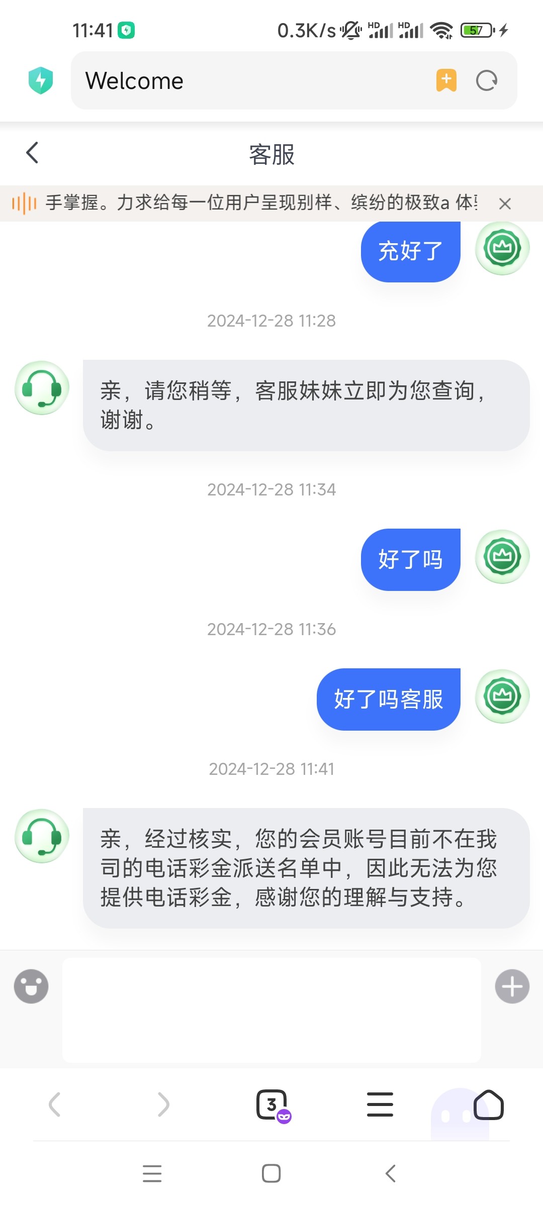 亲,经过核实,您的会员账号目前不在我司的电话彩金派送名单中,因此无法为您提供电话彩金,感谢您的理解与支持。