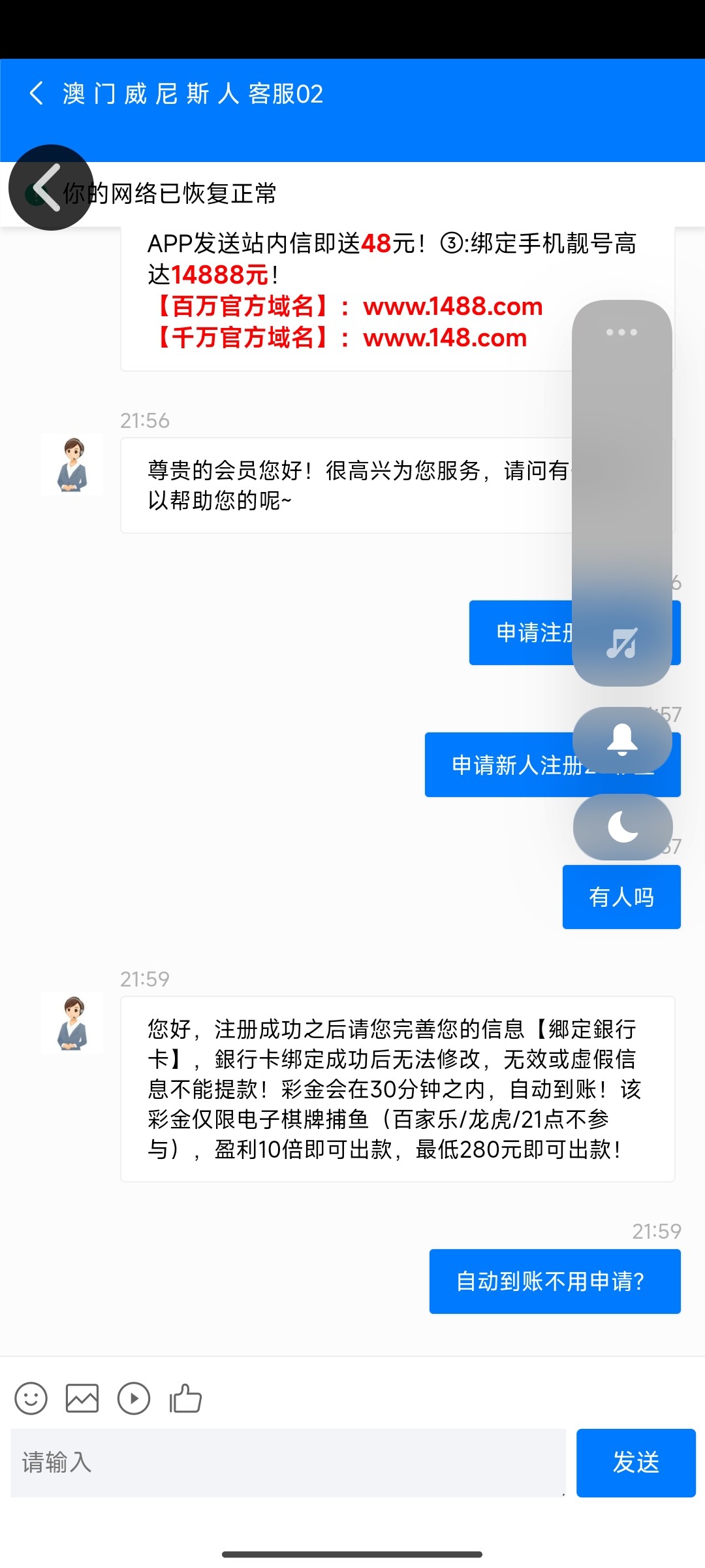 您好,注册成功之后请您完善您的信息【绑定银行卡】,银行卡绑定成功后无法修改,无效或虚假信息不能提款!彩金会在30分钟之内,自动到账!该彩金仅限电子棋牌捕鱼(百家乐/龙虎/21点不参与),盈利10倍即可出款,最低280元即可出款!