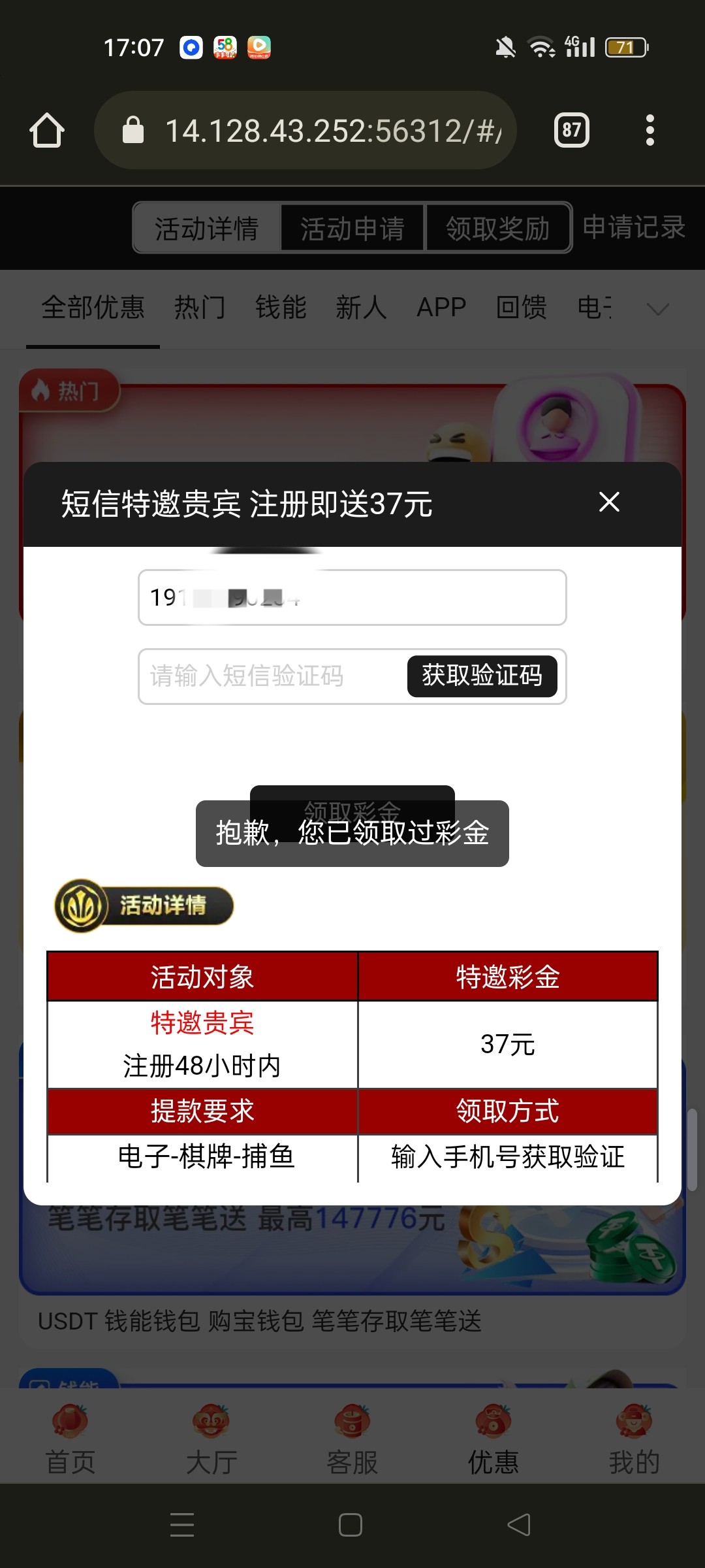老白菜了,短信特邀送37彩金下载APP送16彩金,玩过的重新注册申请试试,有人反馈重置了,具体自测