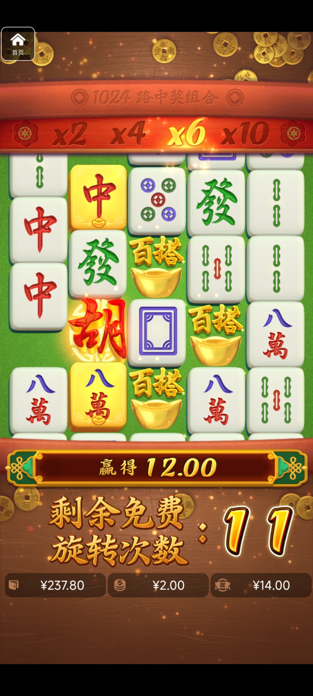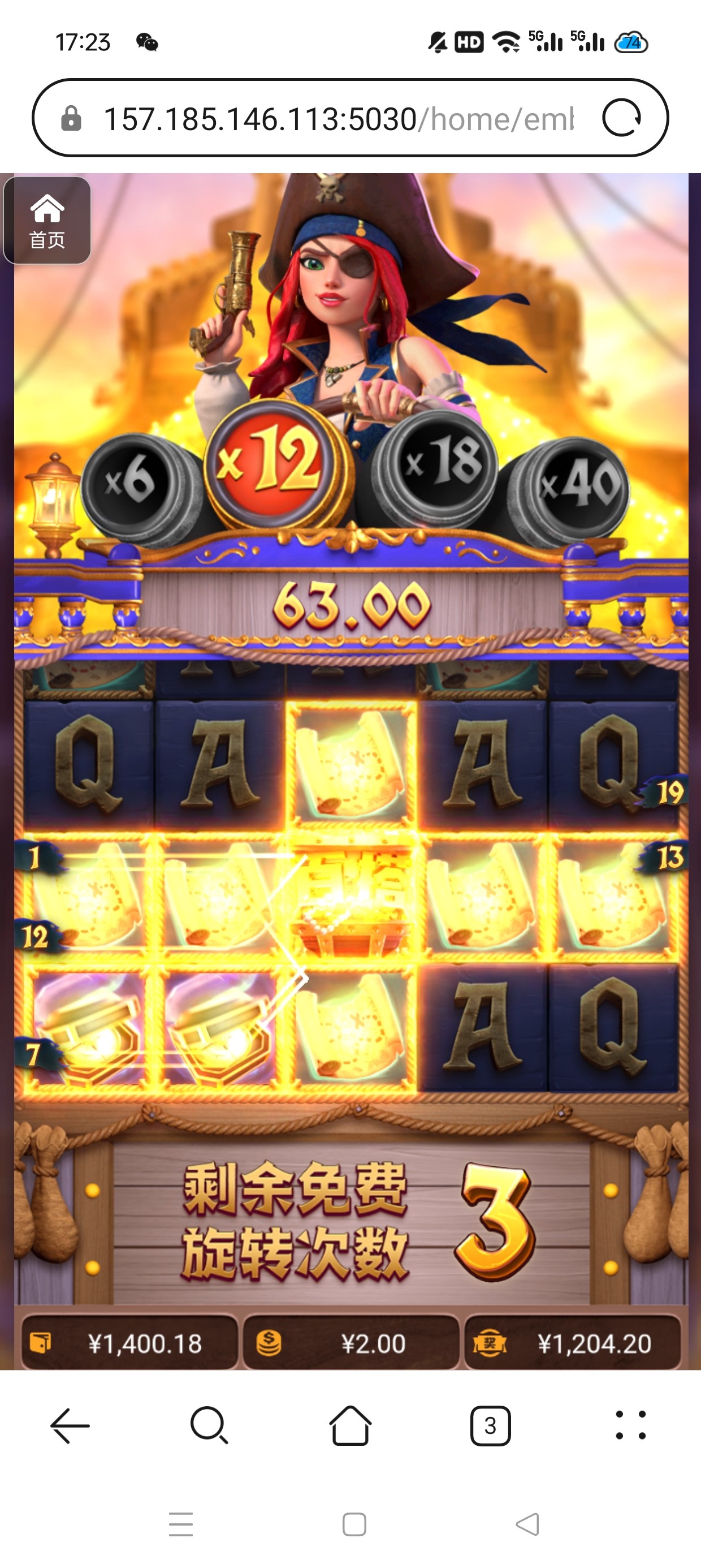 女王1.2进了两次免费,第一次免费➕免费➕免费给了87,第二次免费直接空转出来