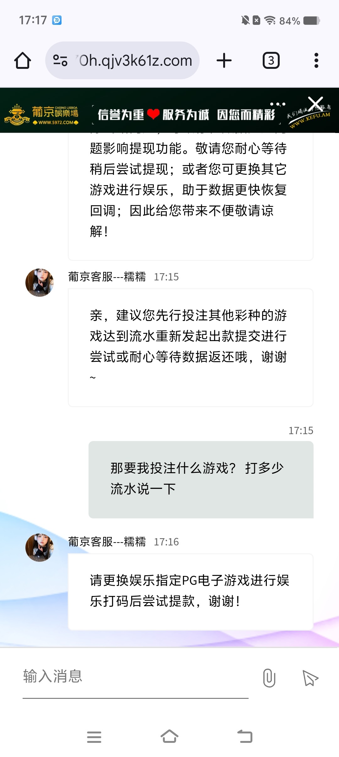 4.4个本金打AG真人流水13万+打到6个不给,客服一直说注单数据延迟,然后引导我玩其他游戏,我又跑去问客服说让玩什么游戏,他说pg电子,我又去拉pg的麻将2打了余额的3倍流水,此时余额5.2个,打完流水还剩4.6个提款还是退回,客服还是那句注单数据延迟的话术,我就明白了我是被黑了。然后我就100一拉麻将故意输了4个多回去,还剩9k多提交还是退回,这两天4.4个本金总共打了流水70万+ 等级v7 最后还是黑了,余额输完后今天我又去问客服可以提款了吗?客服说经查询你的账号是能正常存取款的。哈哈哈输完就正常了,数据也不延迟了,腰不酸了腿不疼了。我也在这台了几年没黑到你你真的不敢相信。最后奉劝大家别再玩大额的了,现在大环境不好经济萧条都没钱了充值上万就危险,任何台子不管你在这个台玩了几年等级多高,最终你还是会被黑。