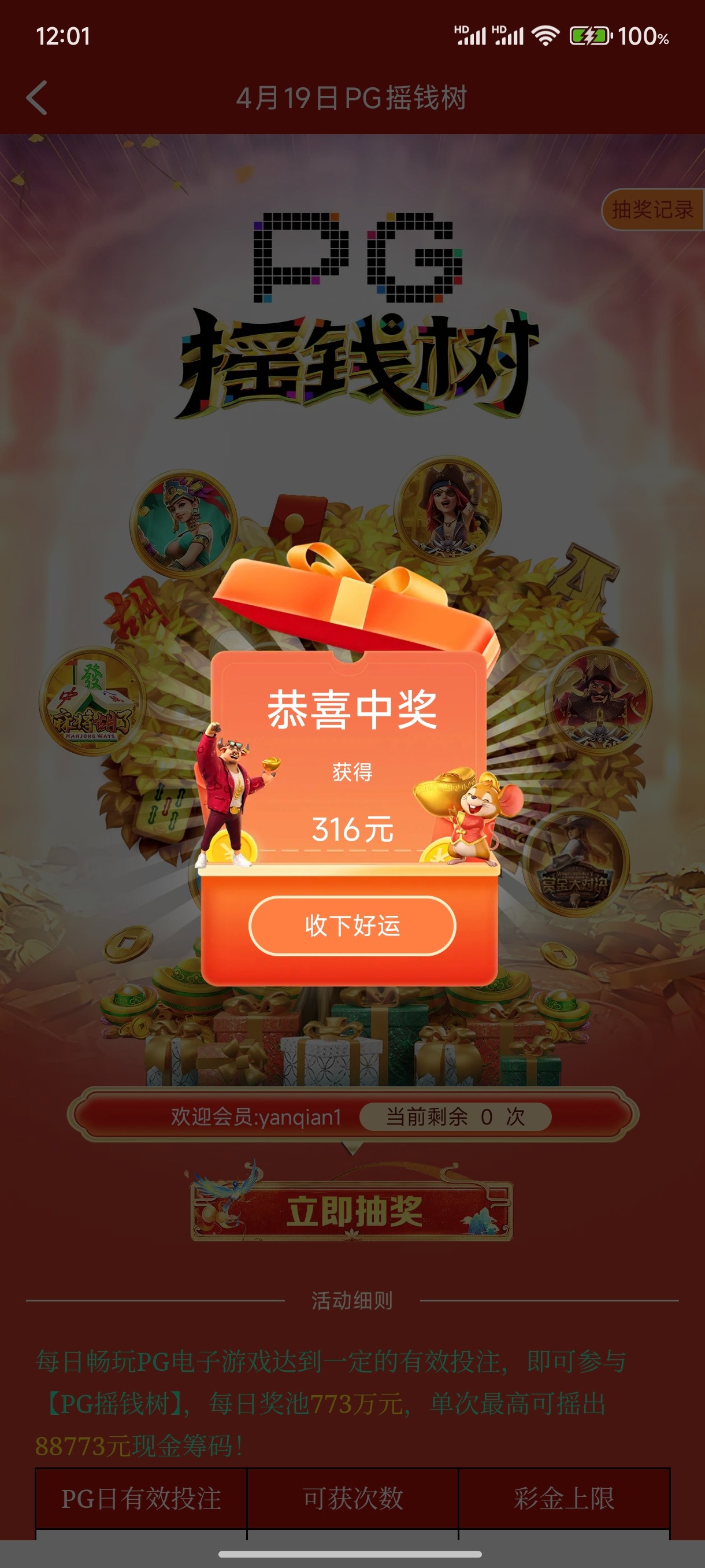 天天看你们773摇钱树抽到大的,前天还看到一个今天到我了(充两百打了2500流水