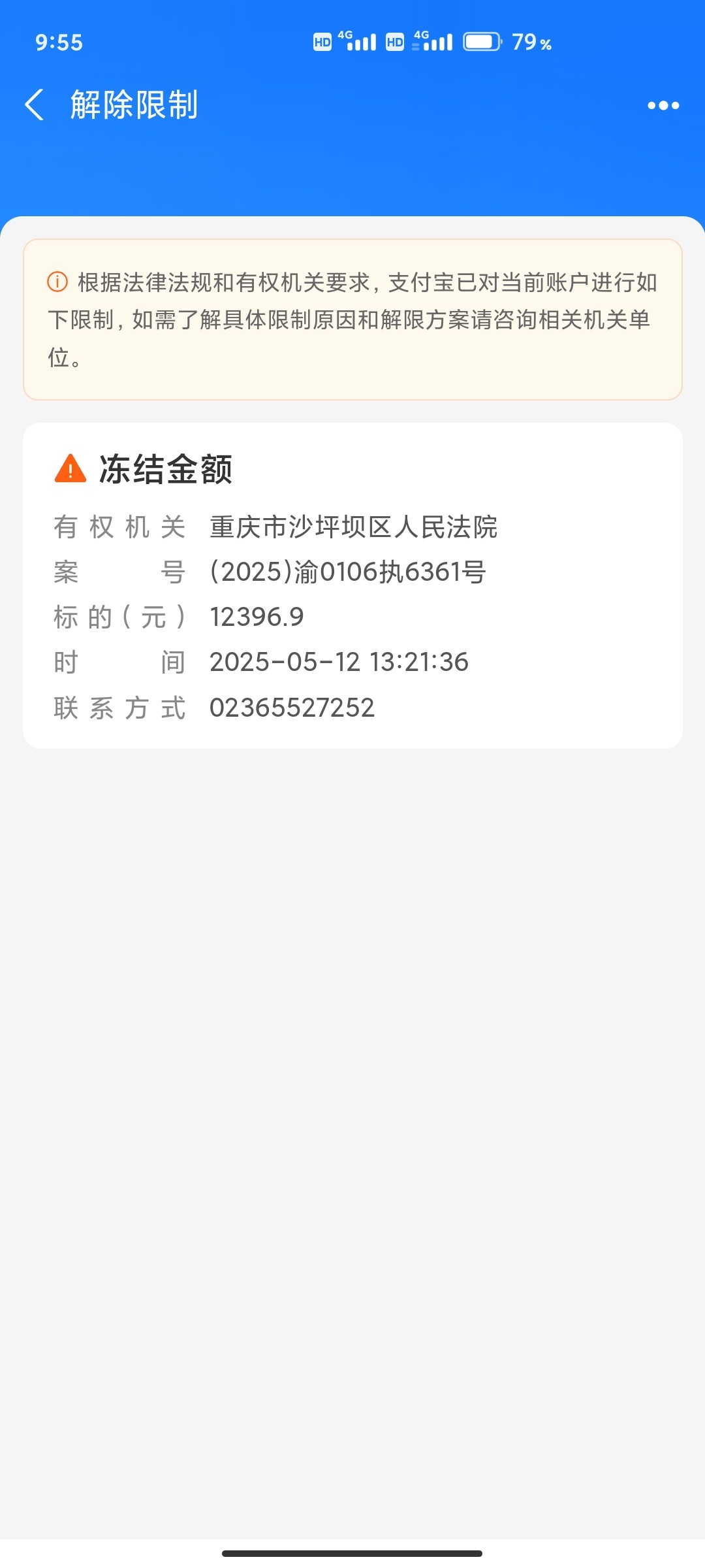 ky253796 我也是这样微信支付宝银行卡都被冻了,把钱还了就行被人起诉了而已