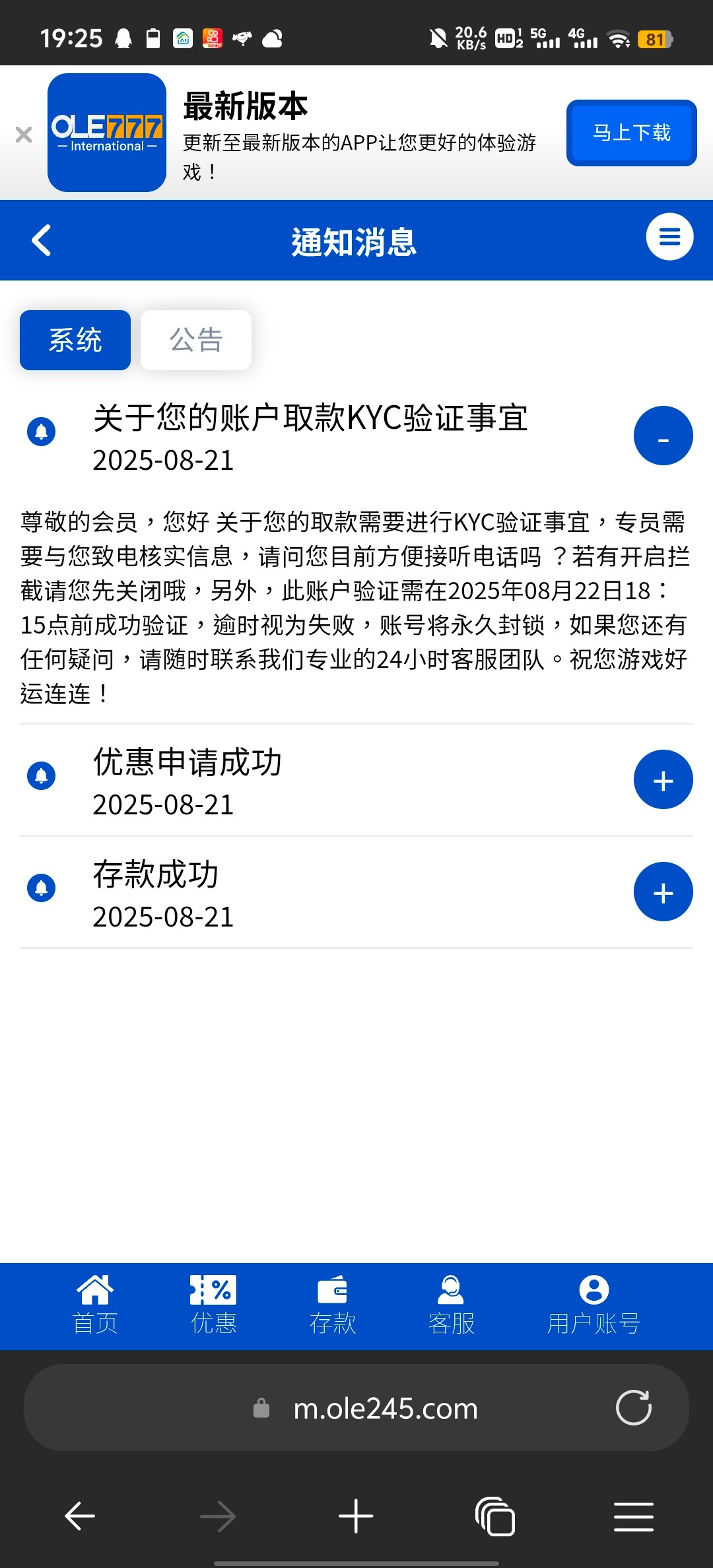 OLE777 ole245.com有没有知道这个平台的兄弟? 400送400,打上2800,现在要手持身份证才能出款 有没有懂这个台的?