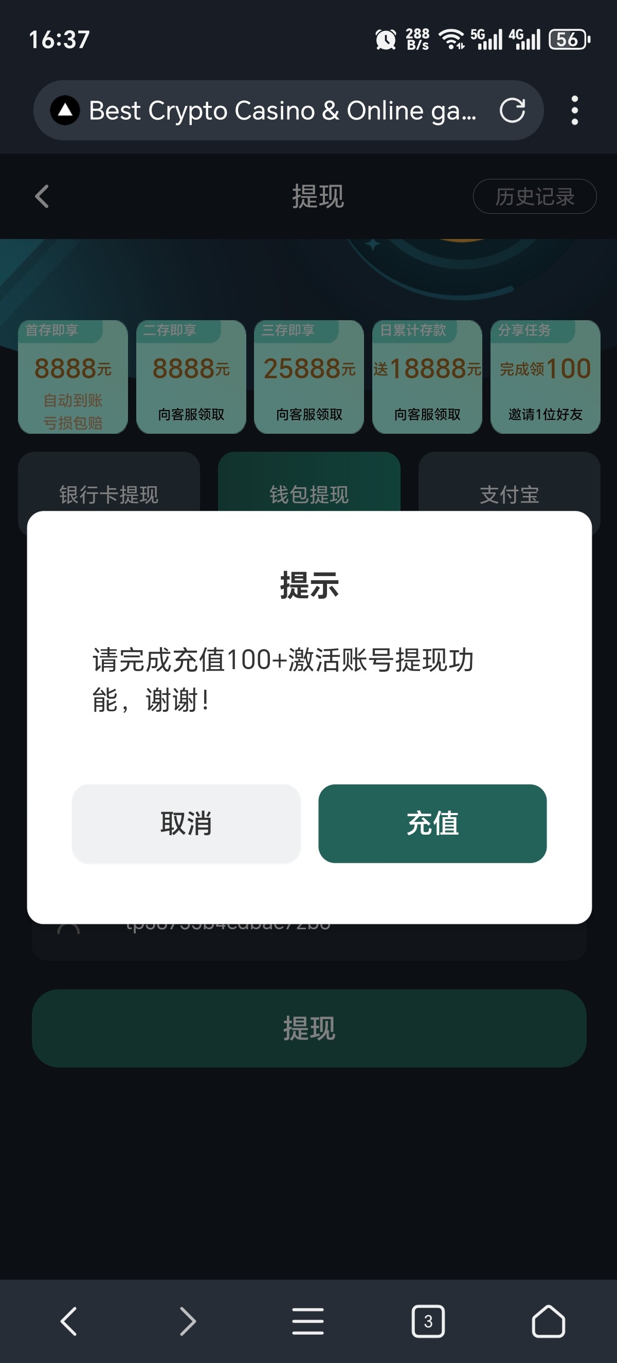 黑台子啊,朋友充值了100.提款叫充值300.他妈的大黑逼一个