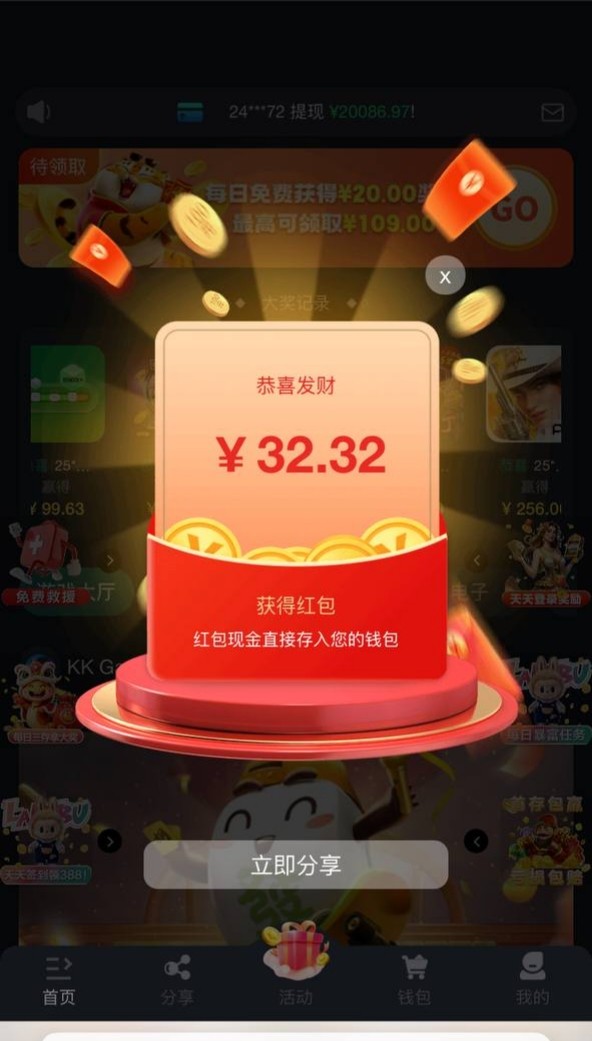 注册自动送30左右彩金,可以在首页截图中间的连连看玩一局给2彩金可以玩到50彩金进游戏领取彩金