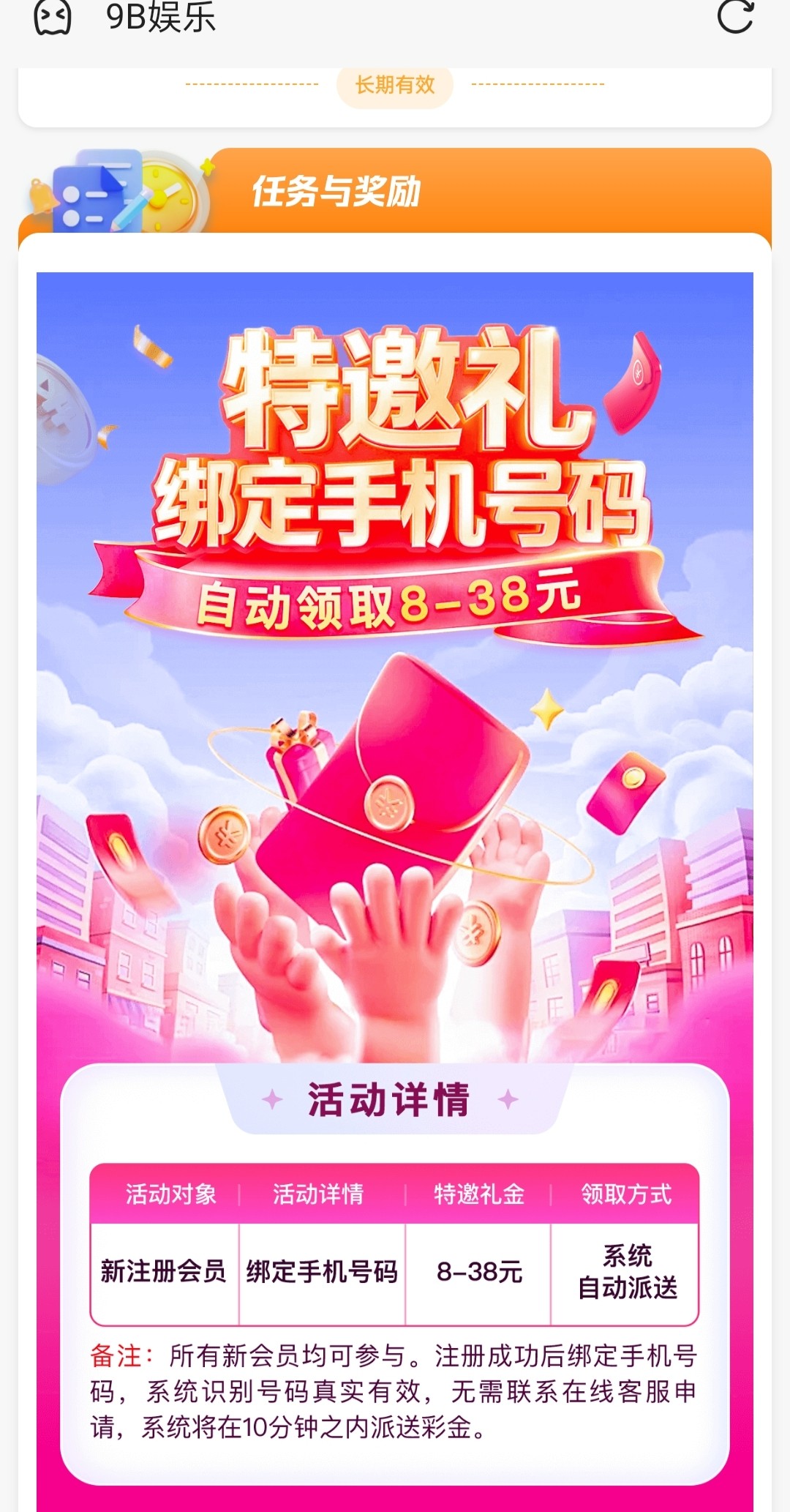 新用户注册绑定手机号十分钟内自动到账,彩金不限制游戏,有就有没有无视吧